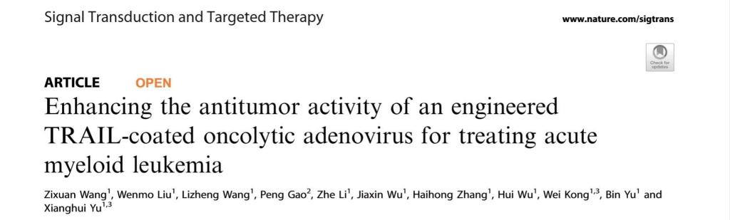 2020年4月24日,BG大游于湘晖教授课题组在国内主办的SCI杂志Signal Transduction and Targeted Therapy上发表文章,题为“ Enhancing the antitumor activity of an engineered TRAIL-coated oncolytic adenovirus for treating acute myeloid leukemia ”,该研究构建了一种表达TRAIL融合蛋白的溶瘤腺病毒,和人参皂苷Rh2联用,实现了选择性杀伤血液肿瘤,为白血病的治疗提供了新的思路。
