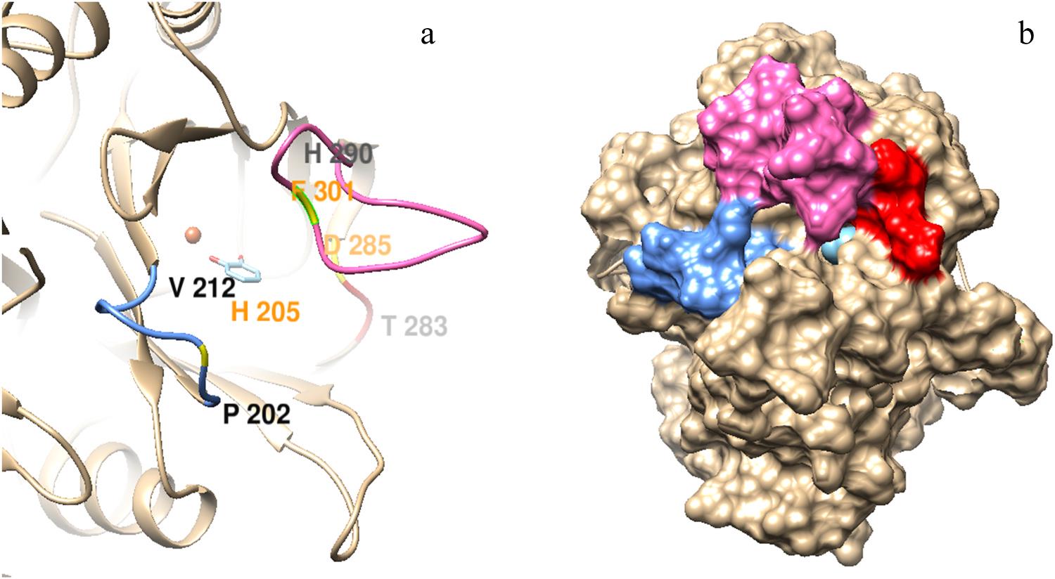 高仁钧教授团队从嗜热微生物弯曲热单孢菌中筛选得到高活性的外二醇双加氧酶Tcu3516,并对其酶学性质进行了表征。通过对Tcu3516序列相似性分析,发现其属于邻氧螯合家族(VOC)/Ⅰ型,且该酶与已报道的其他双加氧酶的序列一致度仅为25-44 %。经过系统发育树分析进一步证明,该酶属于独特分支的、尚未被研究的双加氧酶。酶学性质表征表明,该酶最适温度为50 ℃,最适pH为9.0。且在55 ℃时,该酶仍具有良好的热稳定性。Tcu3516具有广泛的底物适应性,对多种天然底物,包括儿茶酚、3-甲基儿茶酚、3-氯儿茶酚、4-氯儿茶酚、2,3-二羟基邻苯二酚和3,4-二羟基苯基乙酸均有催化能力,特别适合用于环境污染物的清除。通过对Tcu3516进行同源建模,并与底物分子对接(图1),动力学模拟了解该酶与底物的作用方式。并在此基础上,通过半理性设计对其催化口袋末端的环结构进行改造,获得性能良好的突变体。