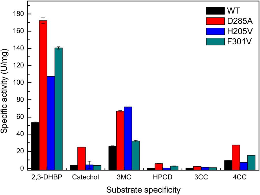为了进一步拓展Tcu3516的底物适应性,对Tcu3516催化口袋末端入口处loop环上的较大氨基酸残基进行定点突变,得到3个突变体F301V、D285A和H205V。经检测,不同突变体对于不同的儿茶酚类底物的催化活性均明显提高(图2),其中D285A的酶活力提高了2-17倍。结合酶促反应动力学结果进一步表明,催化口袋末端的环对酶底物特异性和催化效率有着重要的影响。对已获得的7个突变体的性质分析结果表明,位于盖子结构的F301V对于中链酰基儿茶酚和超长链酰基儿茶酚的催化能力均强于野生型。此结果证明了盖子结构的调整也会提高酶对大底物的催化作用,揭示了盖子结构的重要性(图3)。