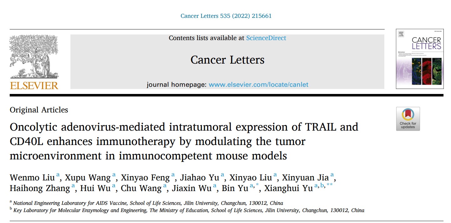 于湘晖教授、于彬教授团队利用前期设计的靶向型溶瘤腺病毒(CRAd5-TRAIL)与表达CD40L的基因治疗载体联用,通过对肿瘤微环境进行免疫调节,增强了抗肿瘤活性,为溶瘤腺病毒介导的实体瘤免疫治疗提供了新策略。研究成果被肿瘤学专业期刊《Cancer Letters》接收,并将于2022年6月1日发表(Oncolytic adenovirus-mediated intratumoral expression of TRAIL and CD40L enhances immunotherapy by modulating the tumor microenvironment in immunocompetent mouse models, 2022,535: 215661, https://doi.org/10.1016/ j.canlet.2022.215661)