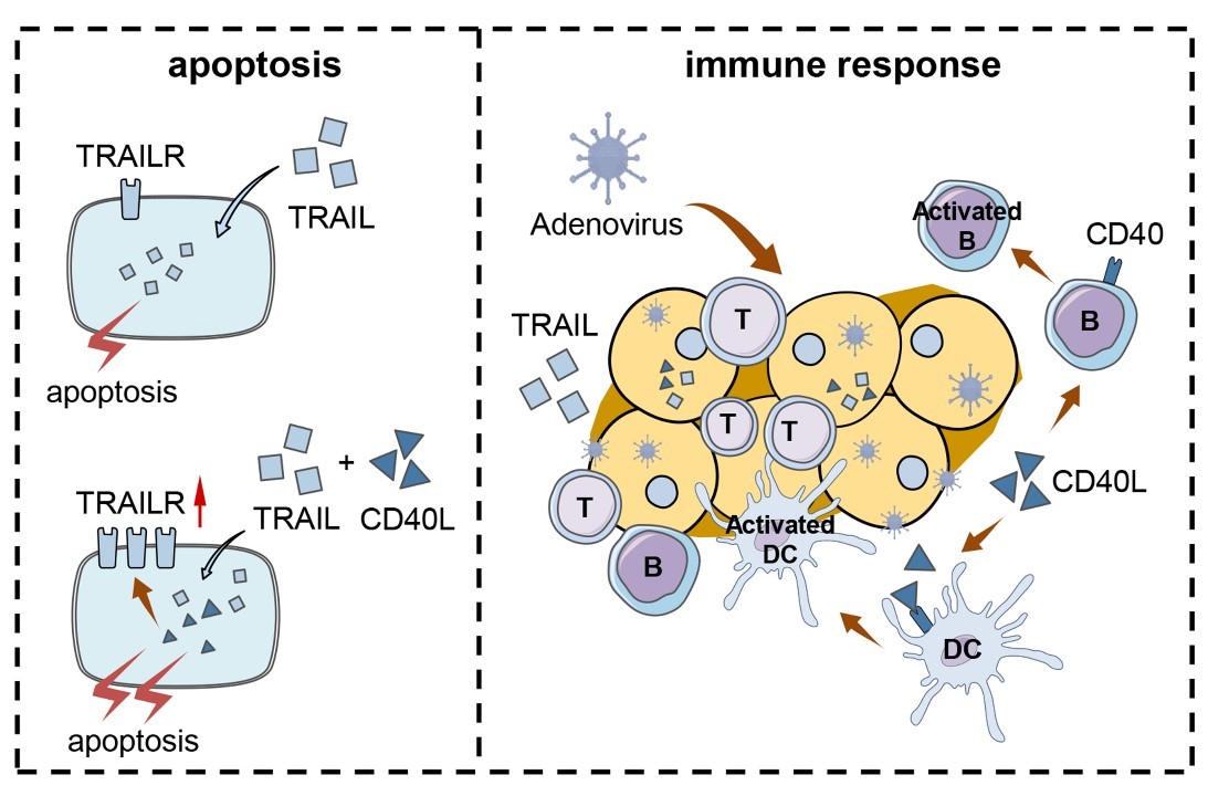 图1. CRAd5-TRAIL和Ad5-CD40L联合治疗作用机制示意图