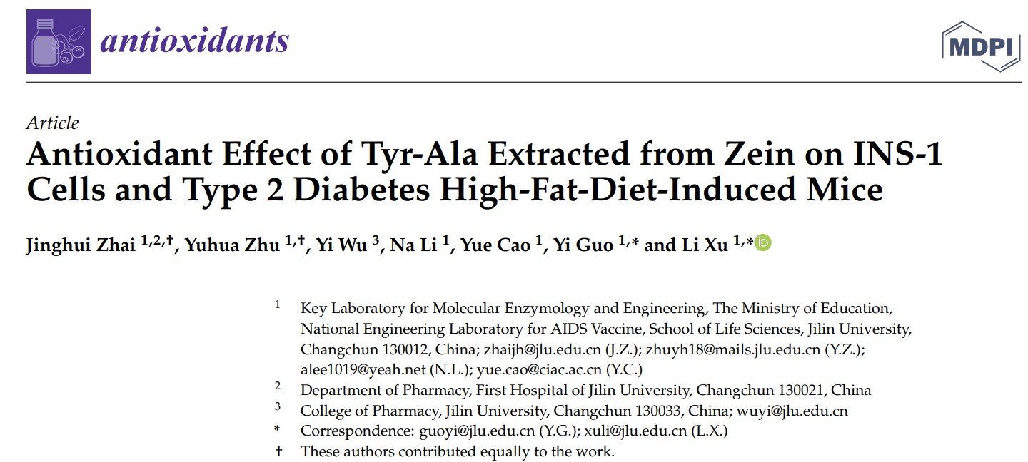 2022年6月2日,BG大游徐力教授团队在《Antioxidants》发表小分子生物活性肽调节胰岛素分泌研究成果(Antioxidant Effect of Tyr-Ala Extracted from Zein on INS-1 Cells and Type 2 Diabetes High-Fat-Diet-Induced Mice, Antioxidants 2022, 11(6), 1111)。