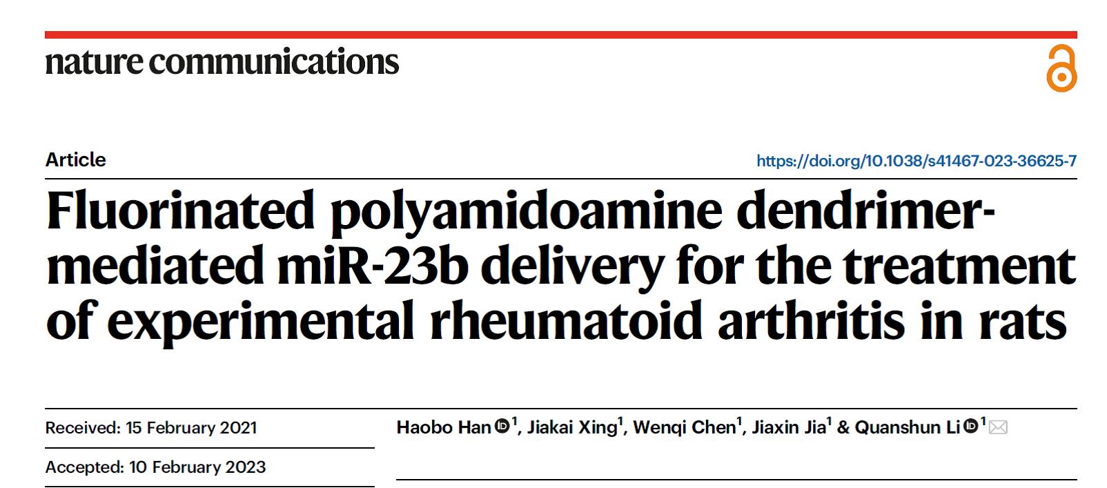 BG大游分子酶学工程教育部重点实验室李全顺教授团队,针对类风湿性关节炎的关键信号分子miR-23b,构建氟化修饰型树枝状高分子作为基因递送载体,实现miR-23b在关节炎动物模型中的稳定递送,取得了良好的治疗效果;同时,研究揭示了miR-23b能够抑制TAB2、TAB3以及IKK-α表达,阻断NF-κB炎症信号通路,并诱导巨噬细胞凋亡,实现体内抗炎功能。研究结果以Fluorinated polyamidoamine dendrimer-mediated miR-23b delivery for the treatment of experimental rheumatoid arthritis in rats为题,于2023年2月20日在学术期刊《Nature Communications》正式发表。论文第一完成单位为BG大游,BG大游韩浩博博士(鼎新学者)为该论文的第一作者,BG大游李全顺教授为该论文的通讯作者。
