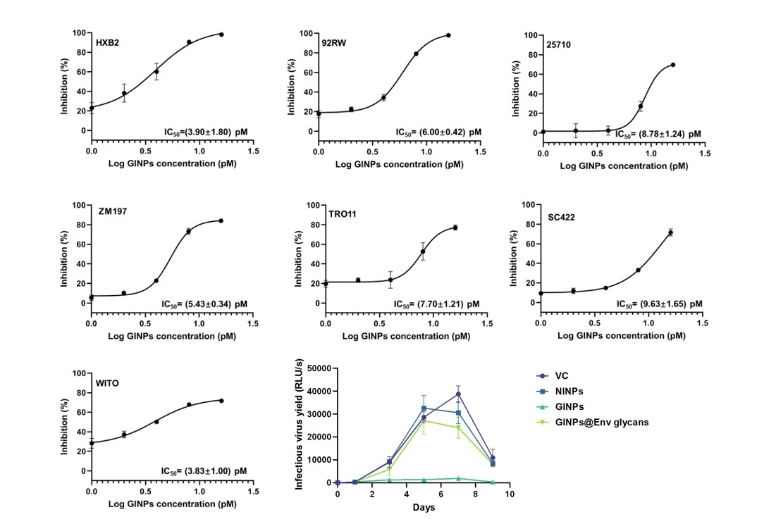 本研究以生物相容性较高的SiO2为内核,以HIV-1病毒糖链分子为模板,以可与糖链上的顺式二羟基进行可逆共价反应的硼酸基团为功能单体,制备了分子印迹纳米微球。体外实验结果显示所制备的分子印迹材料对HIV-1病毒颗粒具有媲美抗体的选择性和结合力,且可抵抗血浆等复杂基质的干扰,为其在真实环境中的应用提供了保障。针对于HIV-1病毒表面糖链的定量蛋白质组学的分析揭示了Env糖链结构的序列特异性,是良好的结合靶点。竞争性结合实验结果进一步表明了Env糖链是印迹空腔的亲和作用位点,从而通过阻断Env蛋白与宿主细胞受体CD4的结合来抑制病毒的复制与感染。细胞水平抗感染实验结果显示该印迹材料对HIV-1一级(tier 1)毒株和难以被天然抗体中和的二级(tier 2)毒株均表现出良好的中和效果;同时对病毒长期复制的抑制效果也非常显著,在9天内可以将HIV-1的病毒载量控制在对照组的1%以下,有效控制了病毒的复制。靶向糖链的分子印迹人工中和抗体为HIV-1的纳米治疗提供了新的解决方案,有着广阔的应用前景。