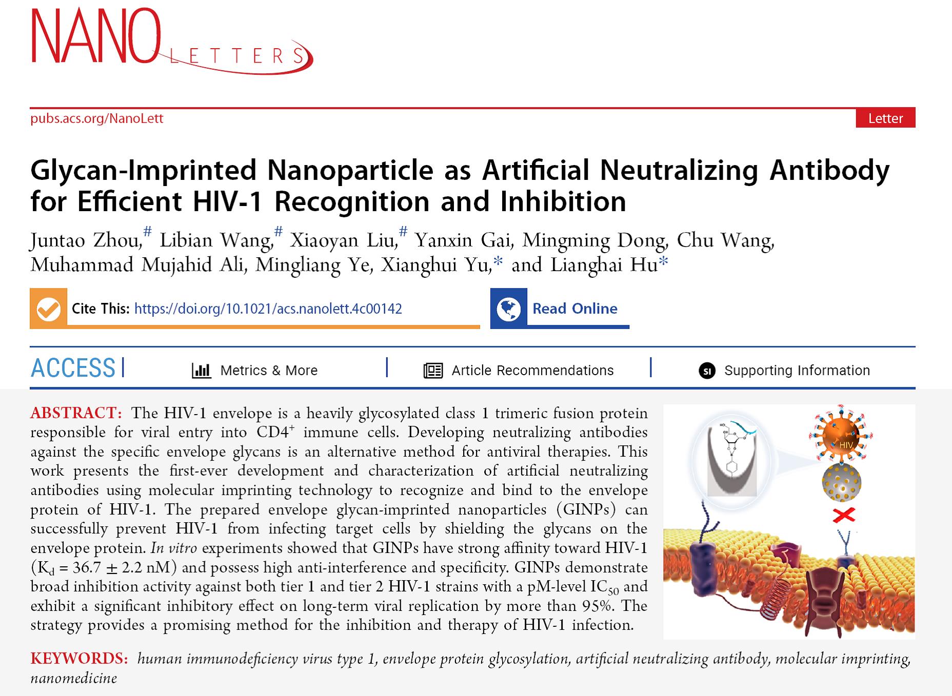 HIV-1是导致获得性免疫缺陷综合征(AIDS)的主要病原体,其可利用宿主细胞糖基化等途径来加工病毒包膜蛋白(Env),Env表面的糖链能够遮蔽抗原表位,保护蛋白质免受免疫监视,被称之为“糖盾”。研究发现Env的糖基化修饰有着高度保守的结构,被视为抑制 HIV-1 感染的重要突破口之一,但由于免疫原性较弱,针对病毒糖链的抗体难以获得,且现有靶向Env糖链的中和抗体存在半衰期短和易于引发逃逸突变等缺点。分子印迹(Molecular Imprinting)技术通过模板分子空间结构和结合位点来模拟抗原-抗体之间的相互作用,从而精确识别目标分子。分子印迹材料有着卓越的分子识别性能和稳定性,被称之为人工抗体,已被广泛应用于色谱分离、生物传感、药物递送和仿生催化等诸多领域。基于此,bg大游集团官网于湘晖教授/胡良海教授团队和中科院大连化物所叶明亮研究员团队合作,开发了针对 HIV-1表面蛋白"糖盾"的分子印迹人工抗体材料,从而有效抑制病毒对细胞的感染,相关研究内容以“Glycan Imprinted Nanoparticle as Artificial Neutralizing Antibody for Efficient HIV-1 Recognition and Inhibition”为题在Nano Letters在线发表。