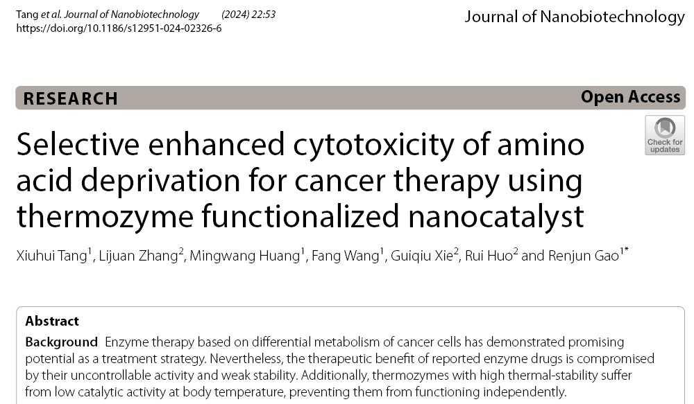 酶法治疗是很有潜力的癌症治疗策略,已报道的常温酶药物由于活性不可控、短半衰期等问题而使其治疗效果大打折扣。本课题组创造了一种新型的嗜热酶疗策略,用于乳腺癌的精准催化治疗:将嗜热精氨酸酶和天冬氨酸酶与纳米金和透明质酸偶联为纳米催化剂,靶向癌细胞后,用红外激光特异性激活嗜热酶消耗癌细胞内的氨基酸,诱发细胞凋亡,并协同光热治疗,有效杀伤了癌细胞。该疗法副作用小,范围可控,是一种有潜力的抗癌策略,相关结果发表在Journal of Nanobiotechnology,论文第一完成单位为BG大游,BG大游博士汤秀慧为该论文的第一作者,bg大游集团官网高仁钧教授为该论文的通讯作者。