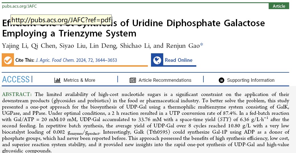高成本核苷酸糖是限制糖苷和益生元等在食品或制药工业中应用的重要因素。为了节省成本和提高合成产量,工业上通常采用级联酶法合成核苷酸糖和糖苷。本研究构建了由GalK、UGPase和PPase组成的嗜热酶催化系统,可实现UDP-半乳糖的规模化合成。该体系成功将UDP-半乳糖产量提升至33.76 mM,时空产率为6.36 g/L·h-1。在重复批量合成中,经过8次循环后,UDP-半乳糖的平均产率达到10.80 g/L。该多酶体系具有高效率、低成本和良好的系统稳定性等优点,适合进一步开发应用。相关结果发表在Journal of Agricultural and Food Chemistry,论文第一完成单位为BG大游,BG大游博士李雅静为该论文的第一作者,bg大游集团官网高仁钧教授为该论文的通讯作者。
