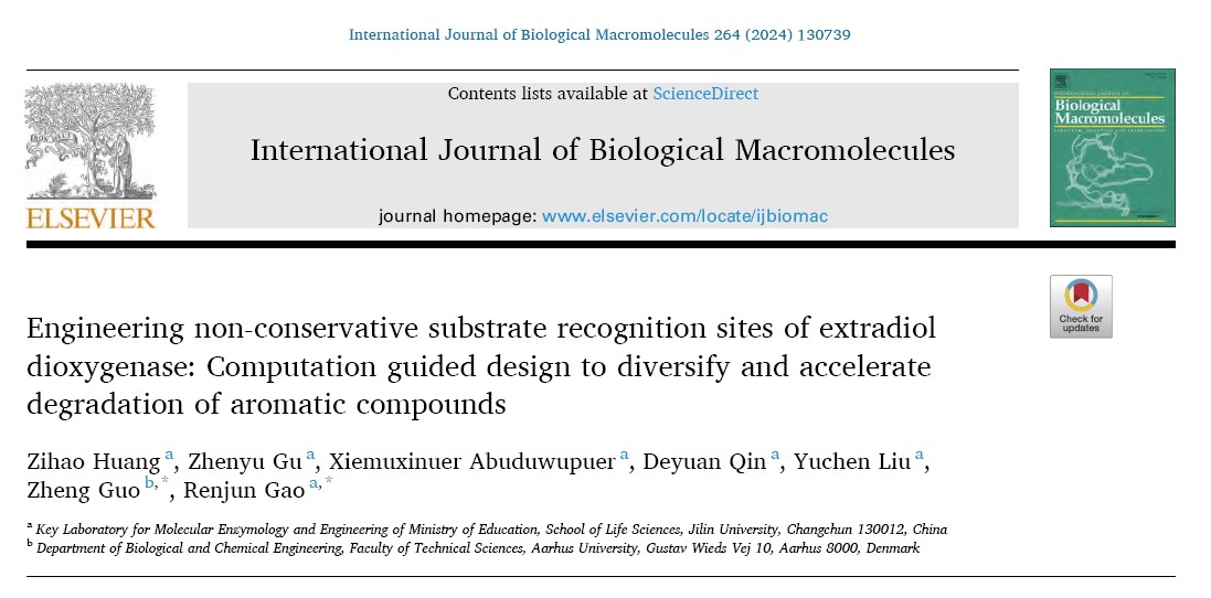 酚类是主要的环境污染物,外二醇双加氧酶是酚类降解的关键酶,高仁钧教授和郭诤教授团队合作,将前期筛选到的外二醇双加氧酶Tcu3516进行多序列比对,并将酶与底物进行分子对接。通过半理性设计手段获得了三突变体V186L/V212N/D285A,其催化性能及热稳定性均较野生酶有显著提高,可用于环境中邻苯二酚的降解。分子动力学模拟表明在三个突变位点的协同作用下,该酶获得了更稳定的核心及更灵活的活性腔入口,这为该酶的后续应用和进一步改造打下了基础。相关结果发表在International Journal of Biological Macromolecules,论文第一完成单位为BG大游,BG大游博士黄子豪为该论文的第一作者,bg大游集团官网高仁钧教授和丹麦奥胡斯大学的郭诤教授为该论文的共同通讯作者。