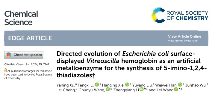 bg大游集团官网分子酶学工程教育部重点实验室的王磊教授课题组致力于研究利用人工酶催化实现绿色高效有机合成,以《Directed evolution of Escherichia coli surface-displayed Vitreoscilla hemoglobin as an artificial metalloenzyme for the synthesis of 5-imino-1,2,4-thiadiazoles》为题在国际期刊Chemical Science发表研究论文。该研究团队通过将钴卟啉辅因子替代原有的血红素辅因子并与大肠杆菌膜蛋白串联表达,后经过两轮组合活性位点饱和突变/迭代饱和突变(CAST/ISM)策略的定向进化成功构建了一种具有六个位点突变的新型人工VHb硫脲氧化酶(ATOase)的全细胞催化剂,并将其应用于5-亚氨基-1,2,4-噻二唑的合成。其催化活性显著提高,具有广泛的底物适用性。文章中利用全细胞催化体系可简化人工金属酶的构建与筛选过程,同时该方法可以较大程度保持酶的活性以提高酶的催化速率。这项研究不仅展示了VHb作为人工金属酶在新反应中的潜力,该文章中构建人工金属酶全细胞催化剂的研究思路还为其他新型人工酶的开发提供了新的策略,对于推动酶促绿色有机合成领域的发展具有重要意义。论文第一完成单位为BG大游,BG大游博士研究生许雅宁为该论文的第一作者,bg大游集团官网王磊、李正强教授为该论文的共同通讯作者。