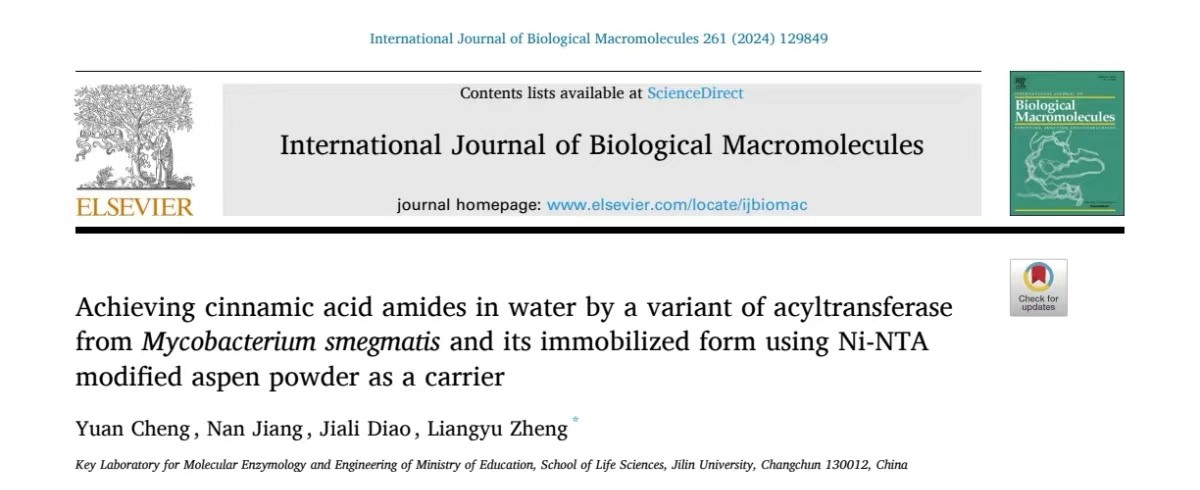 通过虚拟筛选获得的酰基转移酶 MsAcT突变体,具有水相N-酰化反应活性,可以在水相中实现肉桂酸酰胺的高产率制备;以生物质木粉为载体,采用亲和固定化策略,实现了MsAcT突变体的同步纯化与固定化,进一步提高了酶在水相中的N-酰化反应活性,使用稳定性及重复实用性,具有很好的应用前景。该研究论文“Achieving cinnamic acid amides in water by a variant of acyltransferase from Mycobacterium smegmatis and its immobilized form using Ni-NTA modified aspen powder as a carrier”已发表在国际学术期刊《International Journal of Biological Macromolecules》上。论文第一完成单位为BG大游,博士生程媛为该论文的第一作者,郑良玉教授为该论文的通讯作者。