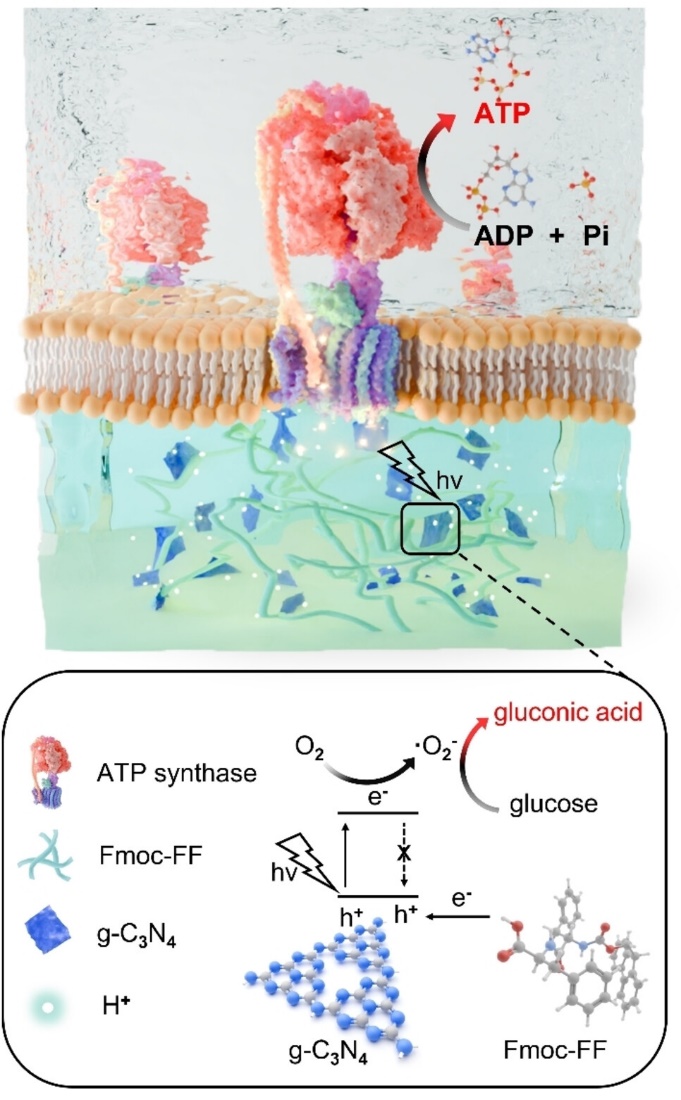 BG大游李悦/李自博课题组构筑了一种二肽水凝胶支撑的ATP合酶组装体系,通过预先包埋g-C3N4纳米片于Fmoc-FF水凝胶,利用二者协同的电子耦合效应,在水凝胶内外构造光控的质子梯度,用于驱动ATP合酶催化生成ATP(图 1)。极细的纳米纤维为g-C3N4超薄纳米片提供了良好的分散位置,有效提升了体外光合磷酸化效率,拓宽了二肽水凝胶在仿生器件领域的实际应用。相关研究”A well-coupled supramolecular system accelerates photophosphorylation”发表于国际学术期刊Angewandte Chemie International Edition(2025,e202417474)。此项研究工作得到了国家自然科学基金重大项目、国家自然科学基金青年项目、科技部重点研发计划的支持。论文第一完成单位为BG大游,李自博副教授为论文的第一作者,BG大游李悦教授、中科院化学所李峻柏研究员、费进波研究员为该论文的共同通讯作者。