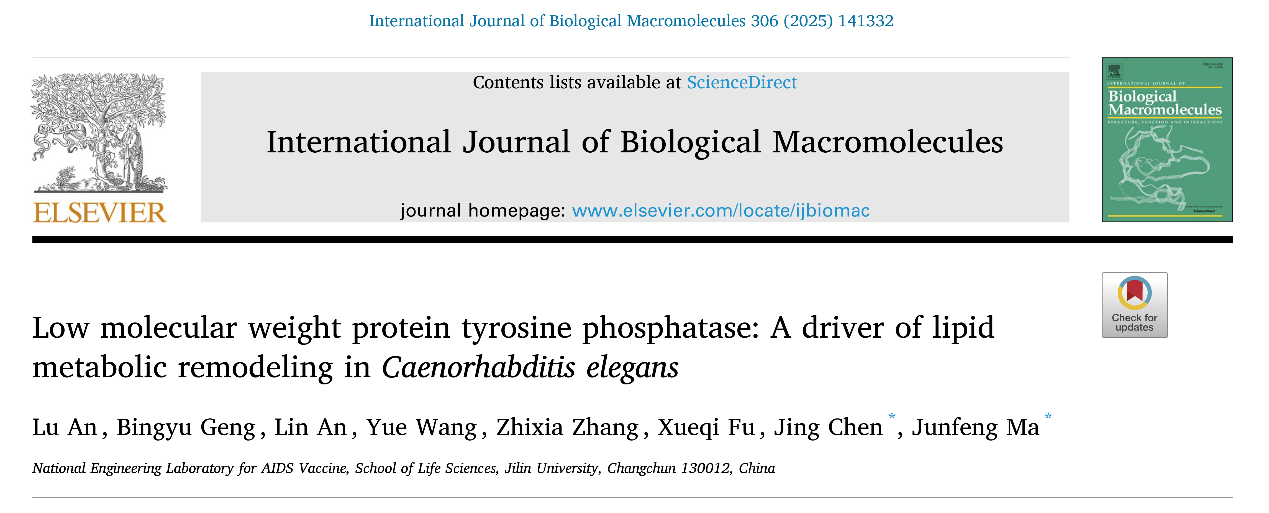 该成果以《Low molecular weight protein tyrosine phosphatase: A driver of lipid metabolic remodeling in Caenorhabditis elegans》为题,发表于国际学术期刊International Journal of Biological Macromolecules。此项研究工作得到了国家自然科学基金、国家重点研发计划以及吉林省科技发展项目的支持。论文的完成单位为BG大游,2022级博士研究生安璐为该论文的第一作者,陈静副教授和马俊锋教授为共同通讯作者。