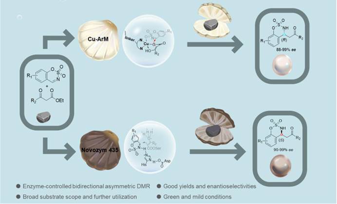 该研究报道了一种酶控双向对映选择性催化策略,用于不对称脱羧曼尼希反应(DMR)合成手性β-磺酰胺酮。研究通过构建铜人工金属酶(Cu-ArM)和利用商业脂肪酶Novozym 435,分别实现对R和S构型产物的高选择性合成。Cu-ArM由生物素化铜复合物与链霉亲和素(WT-Sav)组装而成,催化环状磺酰胺与β-酮酯反应生成R构型产物;而Novozym 435通过其催化三元活性中心调控反应路径,高效获得S构型产物。分子动力学模拟揭示了酶-底物相互作用机制,阐明环状亚胺因稳定氢键网络和紧凑构象而优于非环状底物的原因。该方法在温和水相条件下实现低催化剂负载(Cu-ArM仅0.5 mol%),并成功应用于克级合成及药物分子衍生物制备(如降压抗炎活性分子chroman-4-amine)。该工作为绿色合成手性含氮药物分子提供了新范例,拓展了生物催化在不对称合成中的应用潜力。论文第一完成单位为BG大游,BG大游博士研究生唐勇和许雅宁博士为该论文的共同第一作者,bg大游集团官网王磊教授,李奉熙博士为该论文的共同通讯作者。