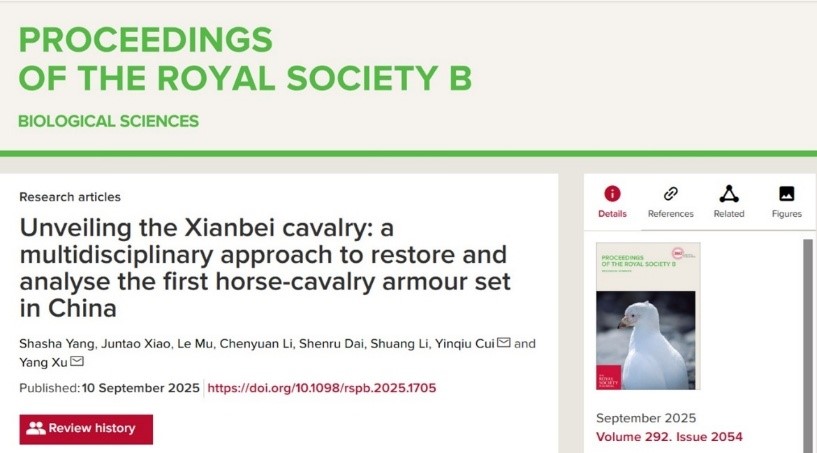 该研究成果以Unveiling the Xianbei cavalry: a multidisciplinary approach to restore and analyse the first horse-cavalry armour set in China为题,于2025年9月10日在国际学术期刊Proceedings of the Royal Society B: Biological Sciences上正式发表。该论文第一完成单位为BG大游,博士生杨莎莎为论文第一作者,徐阳副教授、崔银秋教授为该论文的共同通讯作者。