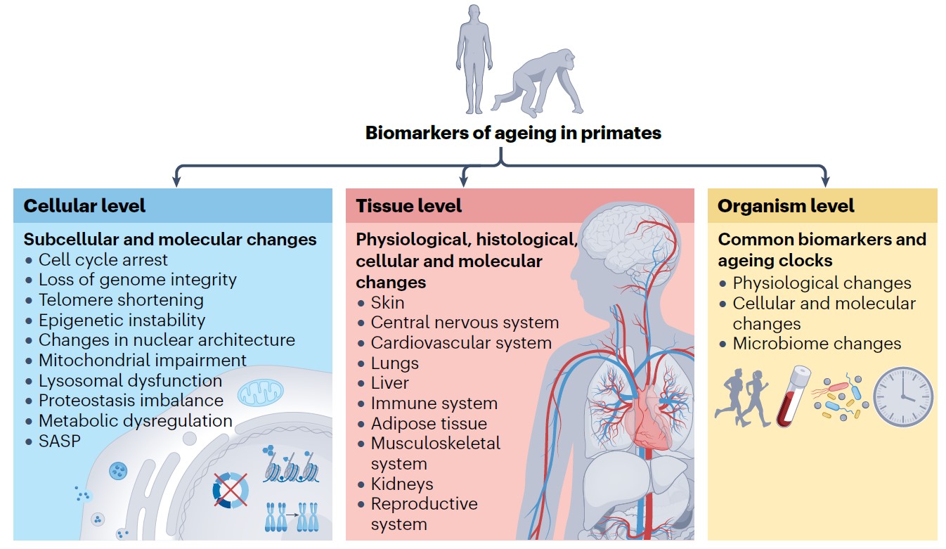 衰老是一个复杂的生物学过程,涉及从分子到细胞、组织、器官乃至整个生物体层面的多层级变化,是许多人类慢性疾病发生发展的重大风险因素。在全球人口老龄化不断加剧的背景下,发展衰老的科学评估对于理解和干预衰老、促进健康老龄化至关重要。鉴于人类寿命较长且面临诸多伦理限制,非人灵长类因其与人类在遗传、生理等方面的高度相似性,成为研究衰老的理想模型。然而,目前对于灵长类衰老标志物的研究较为零散,缺乏系统性整合,这极大地限制了人们对衰老的深入理解,阻碍了基础研究成果向临床应用的转化。