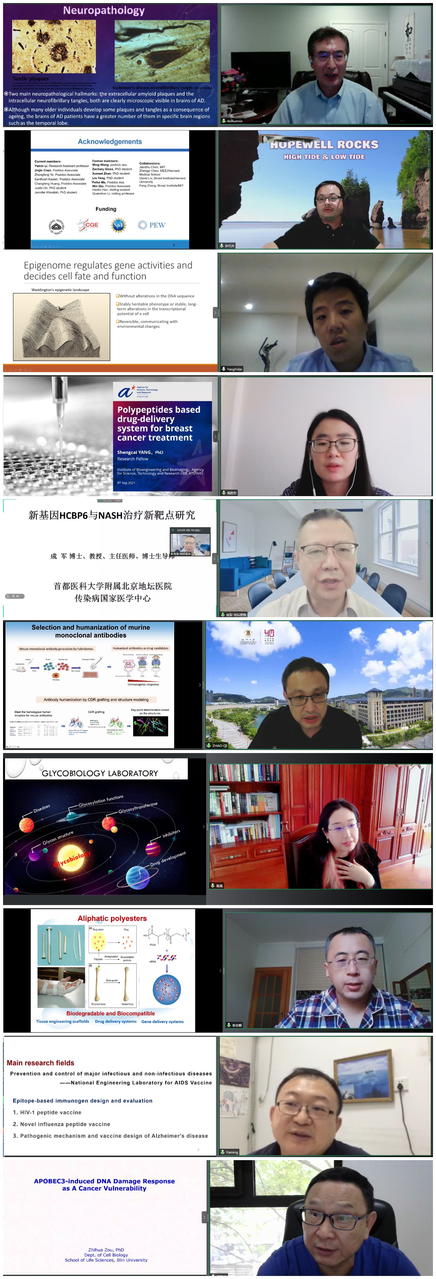 来自德克萨斯大学帕米亚盆地分校徐学敏教授、塔夫斯大学许巧兵教授、渥太华大学杨亦代副研究员、新加坡科技研究局杨胜彩研究员、澳门大学赵琦副教授、首都医科大学附属北京地坛医院成军教授、BG大游李全顺教授、高印教授、单亚明教授、邹志华教授等做了精彩的学术报告。报告围绕生命科学前沿进展主题,内容包括“阿尔茨海默病和淀粉样蛋白假说”、“合成脂质体在核酸递送和基因编辑中的应用”、“COMPASS复合物结构和功能的研究”、“基于聚氨基酸材料的药物递送系统用于乳腺癌治疗”、“新基因HCBP6与NASH治疗新靶点的研究”、“靶向免疫检查点B7-H3的抗体免疫治疗的研究”、“癌症中的糖基转移酶及其生物作用”、“酶促合成生物医用高分子材料研究”、“基于流感HA的广谱表位疫苗研究”、“APOBEC3诱导的DNA损伤反应作为癌的软肋”。公司师生积极参与,现场气氛热烈,学术交流氛围浓厚。