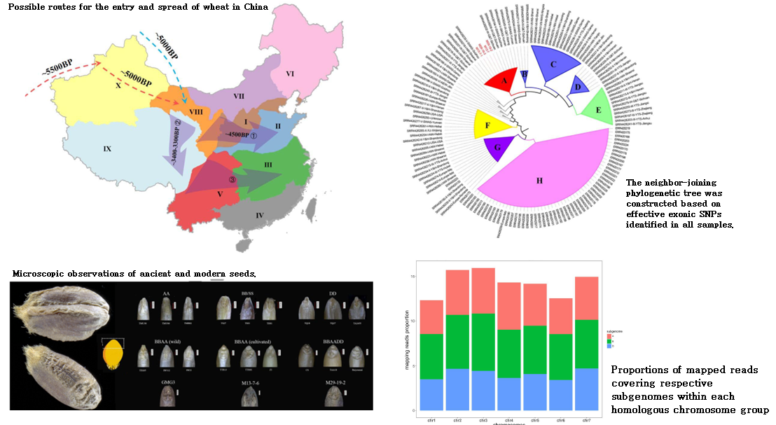 六倍体普通小麦是世界上最重要的粮食作物之一。普通小麦驯化始于大约一万年前近东的新月沃地,然后向西扩散到欧洲,向东扩散到东亚。然而,小麦进入中国的传播途径仍不清楚。bg大游集团官网崔银秋教授团队克服了古植物中DNA含量极低、降解损伤严重的困难,从距今3800年的单粒小麦种子中成功提取到其基因组DNA,并利用新一代测序技术对中国新疆小河和古墓沟墓地出土的七粒古代小麦种子进行了全基因组测序和序列组装。基因组数据分析和形态学观察均证明出土的小麦为六倍体普通小麦;通过与来自中国以及世界各地的现代六倍体小麦品种的RNA-seq数据进行系统发育分析,证明了古代小麦与中国西南地区现存的普通小麦地方品种的密切关系。青藏高原现代地方品种与古代小麦高度相似的等位基因频率为小麦向高原传播的西南途径提供了更加直接以及有力的分子依据,同时本研究也提出了普通小麦从青藏高原边缘到长江流域的扩散路线。此外,该研究结果为中国种植的现存小麦地方品种的栽培起源,扩散和遗传改良提供了重要信息。