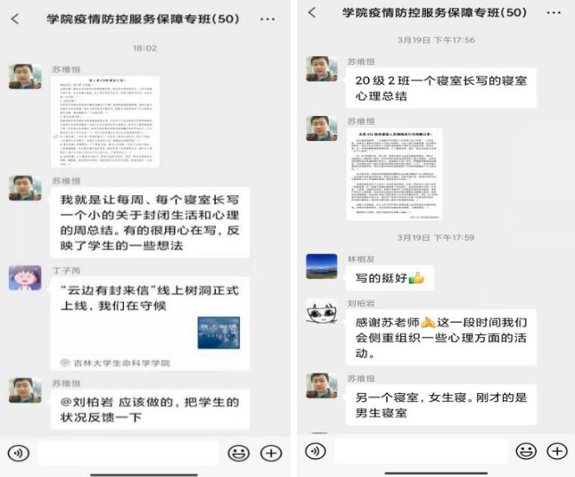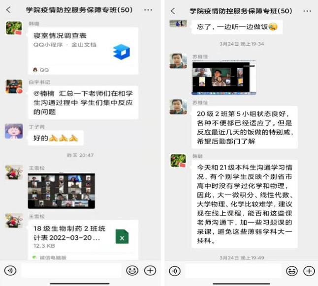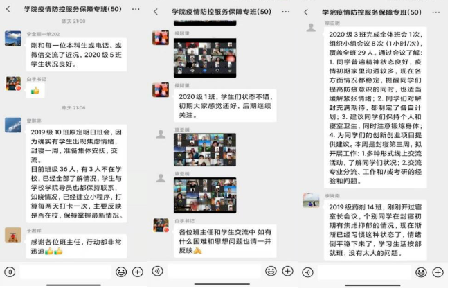 为加强全面疏导和精准指导,全体班主任与学工队伍不断创新工作方法,积极回应员工关切、解决员工诉求,通过专业化的心理辅导、亲情化的思想关怀、常态化的教育引领,引导员工平和心态、阳光战“疫”。结合重要时间节点,通过组织主题班会、小组会议,谈心谈话等形式,就员工关心的考研、保研、就业、毕业设计等问题进行逐一回应,为员工答疑解惑、排忧解难;通过自制接龙小程序、组建学习小组、开展线上打卡、撰写抗疫日记等方式,引导员工缓解紧张情绪、合理规划时间,加强体育运动和自我管理。
