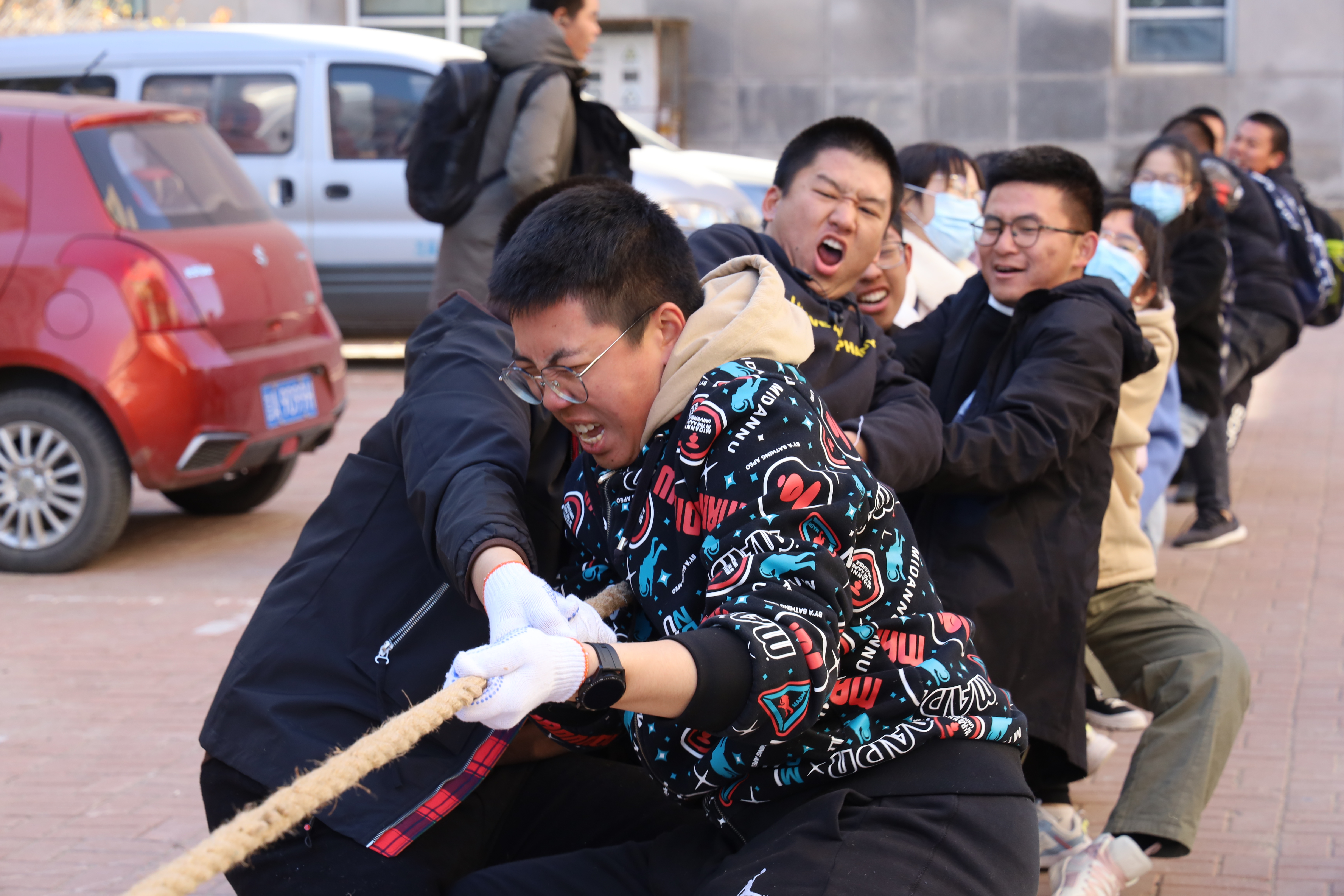 比赛现场,凛冽的秋风盖不过大家的口号与欢乐,正午的阳光赛不过浓浓的热情,各参赛队摩拳擦掌,跃跃欲试。随着裁判的一声哨响,参赛队员瞬间爆发出全身的力气,心往一处想,劲往一处使, 决定胜负的红丝带左右摇摆,两边的队员齐齐后仰,蓬勃的活力在号子中激扬,场边的拉拉队大声呐喊助威,恨不得亲自上场。