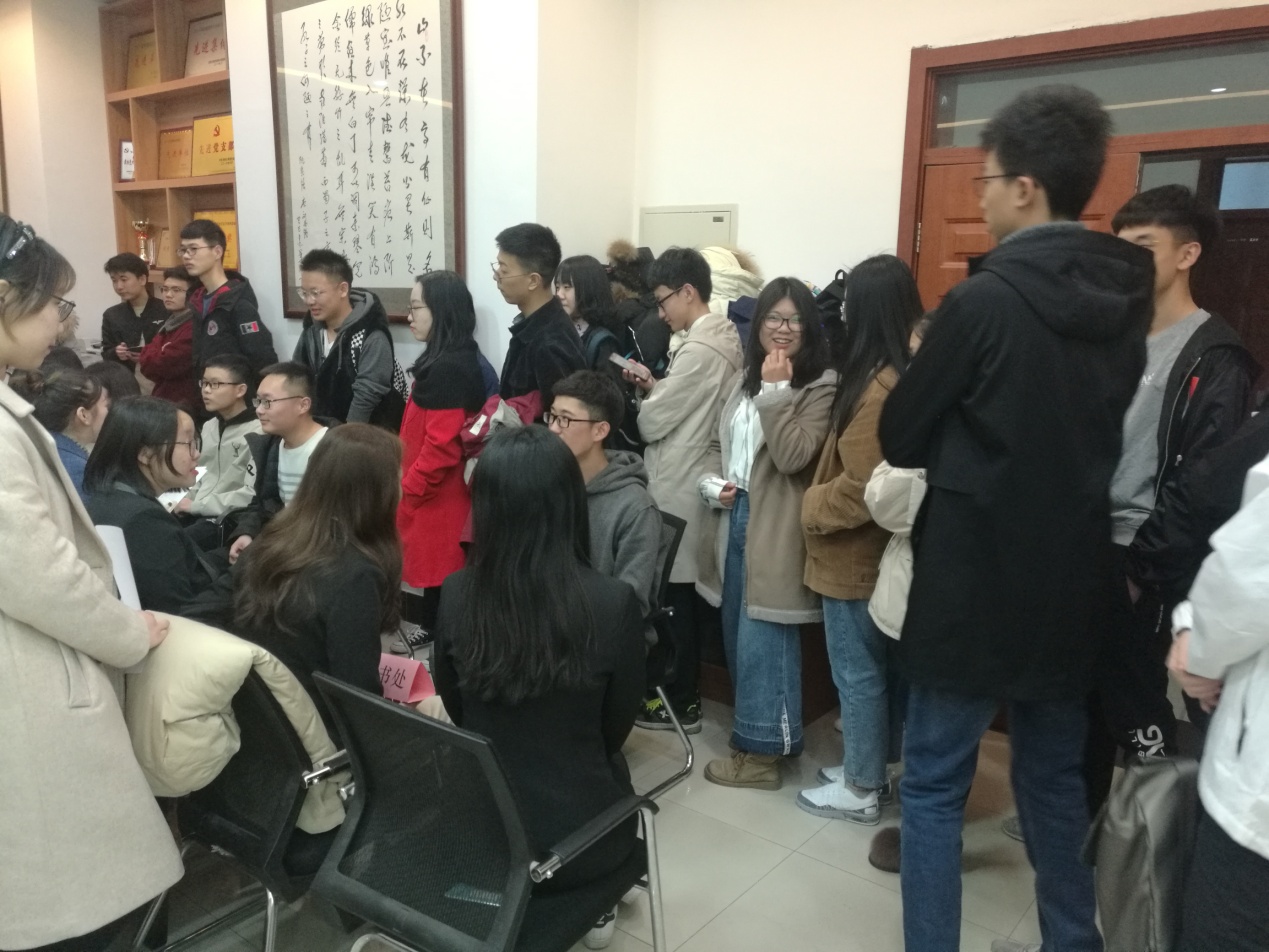 本次纳新面试工作于2019年3月10日17:00在生命科学楼335、107室举行。会前,各个部门成员提前布置好纳新的场所,确保纳新活动有序进行。前来参加纳新的同学有序地向有意愿加入的部门询问相关信息,各部门的部长副部也对新成员进行了严格面试,认真做好面试记录,并向他们明确了加入员工的工作组织所肩负的责任。期间,主席团成员穿梭于各个部门之间,监督纳新的公正公平性,维持纳新活动的正常秩序。