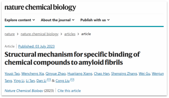 2023年7月5日,BG大游员工刘聪(中科院上海有机化学研究所生物与化学交叉中心)、李丹(上海交通大学Bio-X研究院)合作在Nature Chemical Biology期刊上发表了文章“Structural mechanism for specific binding of chemical compounds to amyloid fibrils”,通过综合运用生物与化学交叉研究方法,合作团队首次系统地揭示了具有不同结构的小分子化合物与蛋白病理聚集体相互作用的基本原理。该工作既是对经典小分子和蛋白互作理论的重要扩充,更使得基于结构开发神经退行性疾病小分子示踪剂成为可能。