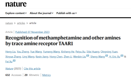 2023年11月7日,BG大游员工、中国科公司上海药物所副研究员王悦以共同第一作者的身份在国际著名学术期刊《自然》(Nature)上以“文章加速预览(Accelerated Article Preview,AAP)”形式在线发表了题为《Recognition of methamphetamine and other amines by trace amine receptor TAAR1》的最新研究成果(图一)。