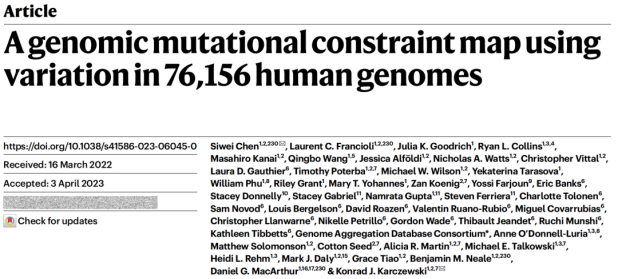 2023年12月6日,BG大游2014届唐敖庆班员工陈思唯(第一作者兼通讯作者)与Konrad J. Karczewski(共同通讯作者)联合Benjamin M. Neale和Daniel G. MacArthur团队共同在Nature上发表了题为A genomic mutational constraint map using variation in 76,156 human genomes的研究论文。
