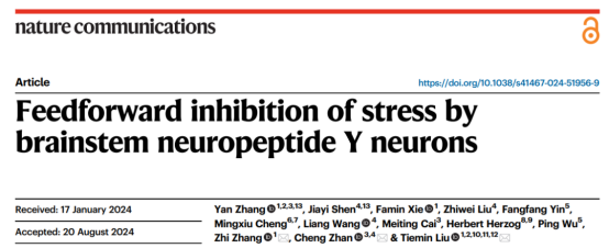 近日,BG大游员工、复旦大学刘铁民教授团队在Nature Communications上发表了名为Feedforward inhibition of stress by brainstem neuropeptide Y neurons的文章。文章发现脑干中缝背核/腹外侧导水管周围灰质(Dorsal raphe nucleus/ ventrolateral periaqueductal gray, DRN/vlPAG)NPY神经元(NPYDRN/vlPAG)可响应各种压力刺激,抵抗压力应激引起的进食量减少和焦虑状态,为压力相关的厌食/体重降低以及焦虑等情绪症状的治疗提供新思路。